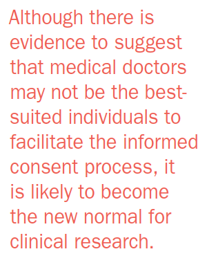 A reasonable reading of the court’s opinion suggests that it intended that the most qualified person perform the consenting process. Medical doctors are not always the best-suited member of the investigation team to administer informed consent. Unfortunately, some medical doctors lack the time or the necessary communication skills to properly deliver non-clinical facts to the study participant. Moreover, financial considerations and study protocol requirements may not be the physician’s specific area of focus and may actually need to be explained by a study coordinator. Finally, the investigative team should consider each participant’s reasons for participating (or not), as well as their hopes for the outcome of the trial. Under the extreme time constraints that many physicians face, this important holistic piece of patient care is not likely to be a priority.